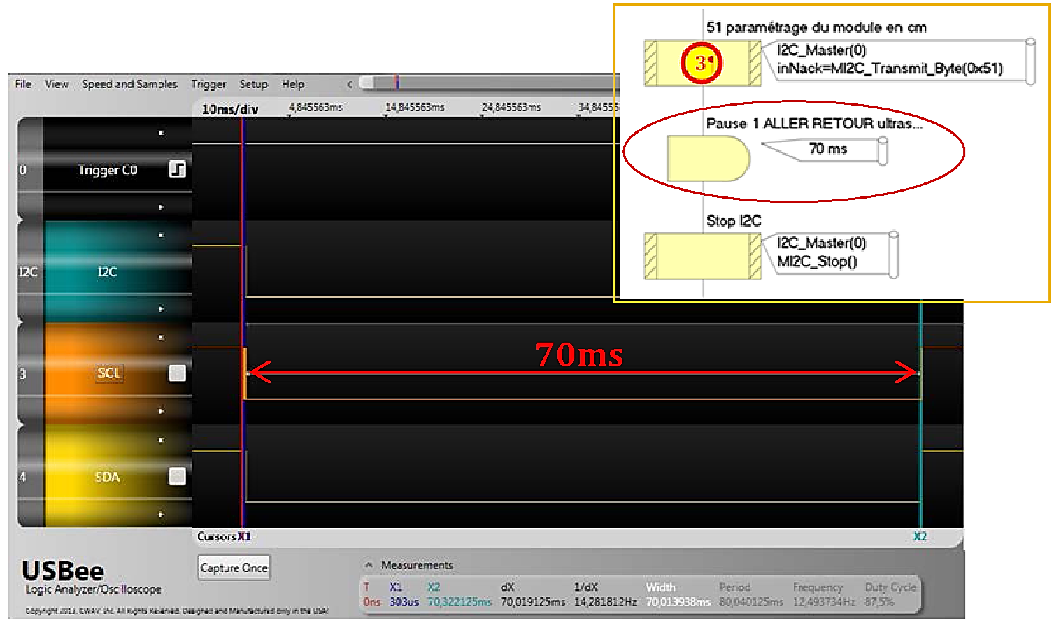 Dans la trame I²C et dans l'ordinogramme de communication avec le télémètre SRF02, on peut remarquer qu'une pause de 70ms intervient juste après l'ordre de configuration et de lancement de la mesure (0x51) :